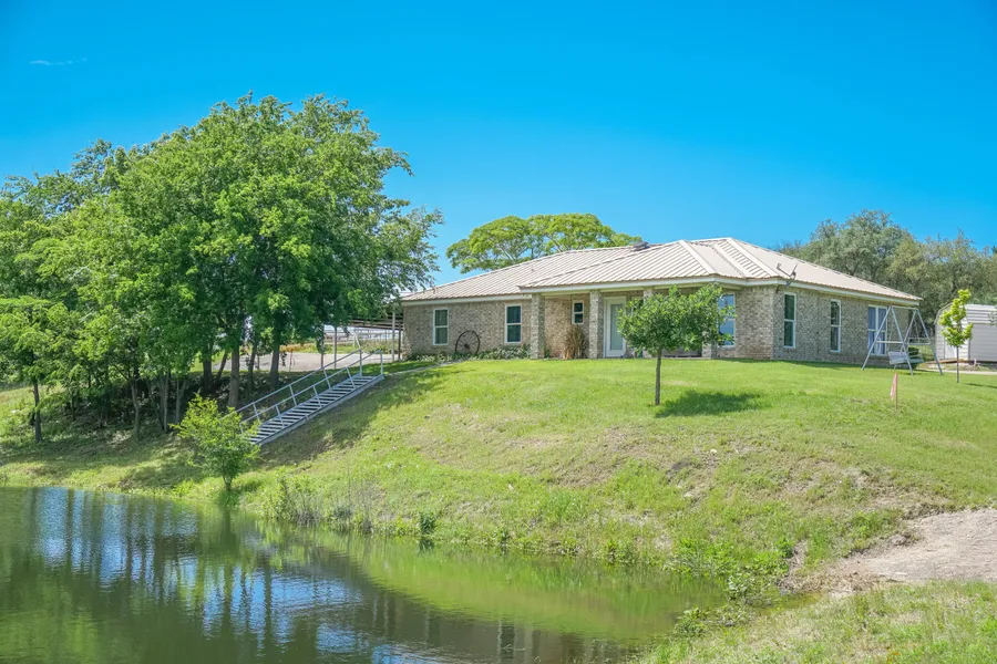The Country Home for sale sits in front of a large pond and the back patio takes in breathtaking waterfront views with a stairway leading down to the water. This 1,736 sq ft home has 3 bedrooms and 2 baths along with an office and large storage/closet that could be easily turned into a third bedroom. This home has an updated kitchen and living room with custom cabinets, granite counters, breakfast bar and ceramic tile floors. This custom home has tray ceilings, custom light fixtures, and lots of windows for the views. This property also has a large 25x30 workshop with water and electric for all your equipment along with covered parking at the house for your vehicles. There is an additional small storage building as well.