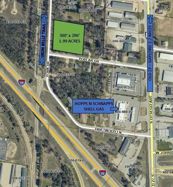 The perfect spot for your snowmobile retreat or multi-family project. Just under two acres adjacent to the Iron Belle Trail, blocks from Exit 279, 2.2 miles to Downtown Gaylord. Zoned R-2 with many building options. Flat and wooded corner lot with frontage on two paved roads. Natural gas and power at street. No association or deed restrictions. Most corners staked but no survey on file.