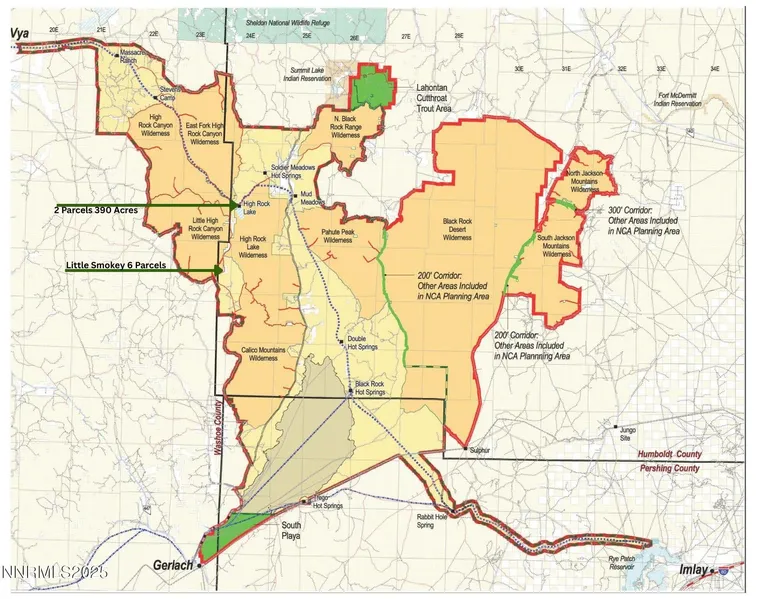 Own a legendary slice of the Wild West. Step back in time and stake your claim to one of Nevada's most remote and historic landscapes. 390 acres split into two parcels sitting at the North end of High Rock Canyon and on the shore of the Seasonal High Rock Lake. This is the only private in-holding at this end of the valley and is surrounded by federally protected wilderness. Seclusion, beauty, and long-term historical value. Once an early homestead, the land holds historic wagon ruts from the Old Applegate Trail, old buildings, and unbeatable views of the reddish-orange canyon walls and the sweeping high desert sage vistas. Located approximately 1.5-hour drive North from Gerlach, Nevada off Highway 34. The property is off-grid and at the far end of a dirt road with wide open spaces and amazing night skies. The region has abundant wildlife, hot springs, petrified wood, hiking, and some unforgettable back country driving. Escape to this ultra-rare piece of Nevada where the wild still rules.