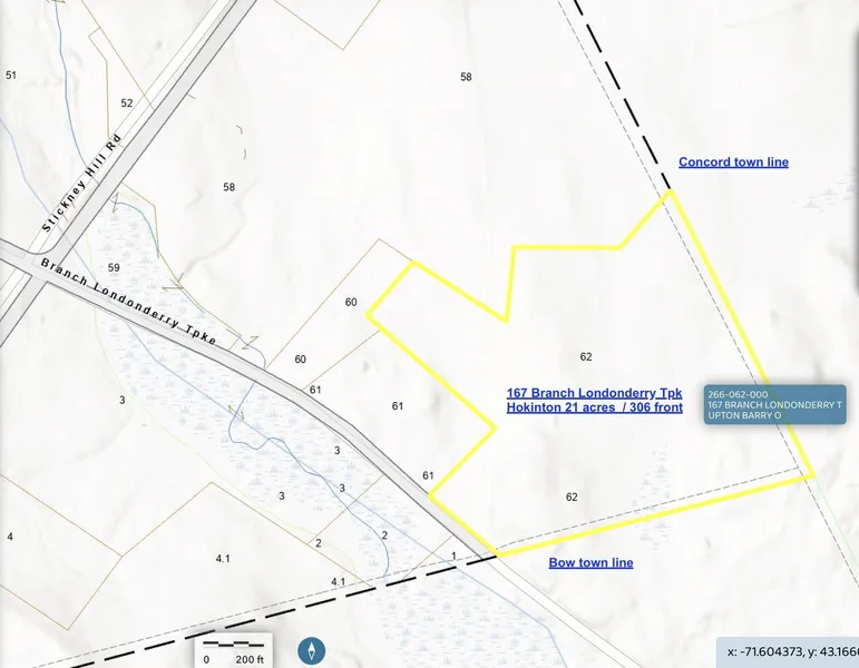 DEVELOPMENT POTENTIAL! 21 beautiful wooded acres , stone walls with small house & garages included ! See Conservation Subdivision VII & or Manufactured Home Subdivision 8.5 of the zoning ordinance. Under Hopkinton's flexible zoning guidelines to help promote affordable residential communities in harmony with the natural landscape such as the Conservation Subdivision in this r3 district, the min lot size per sf dwelling is 45,000 sf with 75 min frontage while this lot has 306 feet of EXISTING road frontage. 4 family attached dwellings are also permitted by right. 50% or more of the land would remain in conservation. This land has been surveyed, topo, prior wetlands, etc are done, previously was approved , now expired, for a 5 lot subdivision with new road, but road cost were too high. Yes there are some wetlands and slopes, this is the granite state but there is really primo nice developable area!! Additional home sites will likely have LUCT. Using conservation ordinance & existing frontage makes some great options! Your development ideas would need town approvals, perhaps 2-3 large conservation lots on existing road frontage, or keep existing home for rental or resale and add separate 4 unit condo, perhaps use small existing home while building new home on the rear. Lots of great options! Buyer should conduct their own due diligence and zoning review.