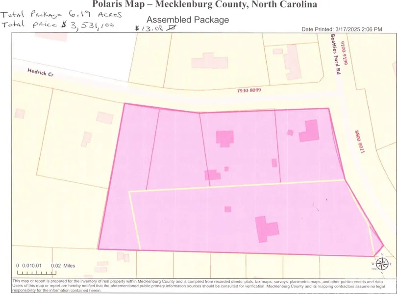 This property is the rear property in the photo in a rapidly growing area near the corner of Mt. Holly Huntersville Rd. and Beatties Ford Rd. Min's from I-485 and Northlake Mall. Other commercial properties near this property include Food Lion, CVS, Family Dollar, Daycare, BBQ house, Karate School & Mini Warehouses. Approx 300 yards from the greenway. Agent is related to seller. Road has been widened with turning lane and city water, sewer, & gas are all at the street. This will make a great commercial location but will need rezoning and there are other properties available to do a larger project. Call agent for details. House has no value. There are a lot of approved residential projects coming to this area. 2005 Small area plan for this property would like commercial/ retail, office. Corner lot. This can be combined with other listed property for a 6.19 ac rectangular package at $3,531...