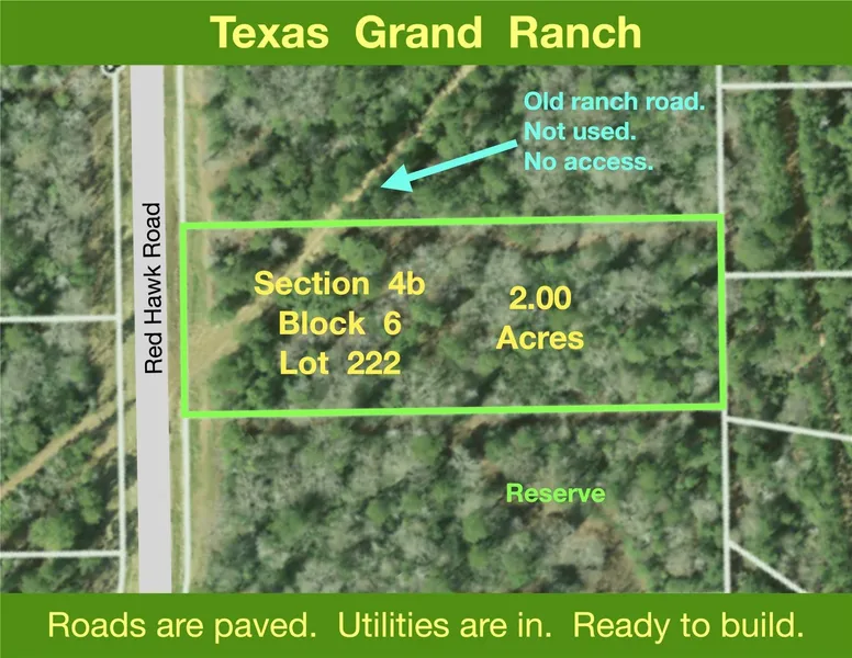 2.00 ACRES > ON AN EXTRA QUIET LOOP > GENTLY ROLLS UP FROM THE ROAD FOR AN ELEVATED HOMESITE > Ready for peace & quiet & privacy? Ready to build. Start building whenever you want. Choose your own builder. EZ access to I-45. Texas Grand Ranch is a large lot, wooded community in the rolling hills. Country lifestyle for your custom forever home. Mature trees, paved roads, water & HIGH SPEED fiber optic internet. Covered pavilions, parks, ponds, playgrounds, BBQ areas. Minutes from shopping, dining, schools, hospitals, and entertainment. Low taxes - No MUD tax. HIGH & DRY - Average elevation is 325’ ASL. Surrounded by Nat’l Forest (161,508 acres) & State Park (2,083 acres) with 100’s of miles of hiking, biking and horseback riding – boat launches & beaches. Come home to Texas Grand Ranch.