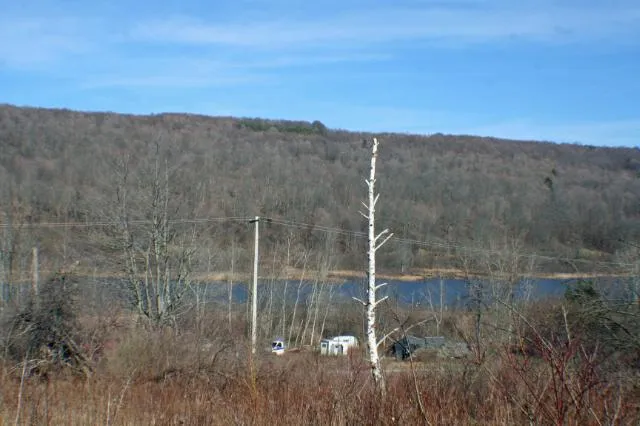 This is a forgotten, unused property that will make a wonderful place for its new owners. Theres an old driveway that needs some cleaning up that goes up onto the land, but once up there the view from the field (about 2 acres) is fantastic. Its not hard to imagine a cabin or camper setup on the land overlooking the pond across the road. Electric service runs through the property and theres an old electric pole set for service to a campsite or trailer.