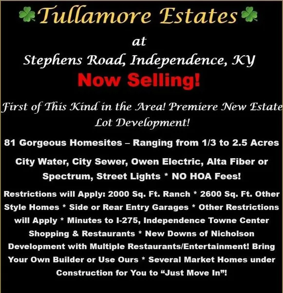 Perfect Time to Start the Process for Your New Home! Large .75 Acre Lot in Premiere New Estate Lot Community! Tullamore Estates at Stephens Rd/Independence! First of It's Kind in the Area! Come be a Part of this Prestigious New Development Conveniently Located Just 10 Minutes to I-275, Minutes to Independence Towne Center w. Shopping/Dining/Krogers/Publix/Walgreens & More! Minutes to the New Downs of Nicholson with First Watch, Spear Ridge Cafe, New Upscale Dining, Brewery & Event Center Coming Soon! Tullamore Estates is a 81 Lot Custom Home Site Development Designed to Allow Homeowners to Enjoy their Custom Homes with a ''Little Space'' for Privacy & Personal Enjoyment! Restrictions Include: 2000 Sq Ft. Minimum for Ranches*2600 Sq Ft for all Other Styles*Side or Rear Entry Garages*Gorgeous Wooded Back Drops*Some Lake Lots*Sizes Range from .30 acre to 2.25 Acres with Abundance of Level Lots & Softly Tapered for Walkout Lower Levels - Peaceful Cul-de-sac Lots Surrounded by Woods * Something for Everyone! Bring Your Own Builder or Use Ours! Street Lights*Owen Electric*NKY Water/Sanitation/Alta Fiber & Spectrum Available*Additional Restrictions Apply*No HOA Fees! Come be a Part of this Very Special New Development! Pricing & Lot Sizes are on the MLS Attachments