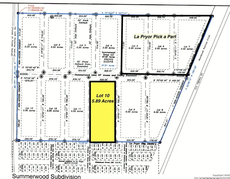 New "Summerwood Subdivision" in La Pryor, Tx offering unrestricted lots from 1-6 acres. This Lot 10 has 329' frontage. Water and electricity will be available at the street. This land is unrestricted for use as a homesite, agriculture or business. Property tax information is not yet available as taxes have not been assessed yet. Seller finance available. Ask for terms. Veterans! Use your Texas Veterans Land Board Benefit to buy with a low 5% down payment.