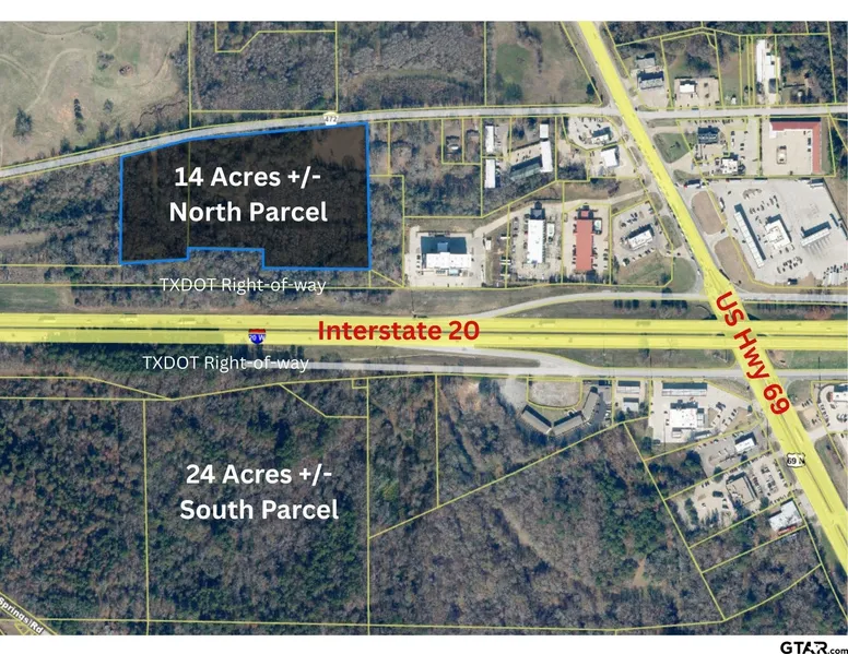 This 14+/- acre tract in Lindale city limits is located between Dallas and Shreveport. Zoned C2-Community and Regional Commercial District with approx. 1080 road frontage along CR 472 (West Lindale Crossing), the south boundary runs along INTERSTATE 20. This 14+/- acre parcel on the NORTH SIDE of INTERSTATE 20 is approx. 1050 ft to Hwy 69. This parcel will have access to a future I20 frontage road that is part of TXDOT Tyler District's I20 corridor expansion project. Reference I20 Lindale - Harvey Rd. (CR 433) east to US 69 project. Utility access: City of Lindale (water and sewage), CenterPoint Energy (natural gas), Oncor service area (electricity). There is an additional 24+/- acre parcel that is available on the SOUTH side of I20. See MLS#25010554.