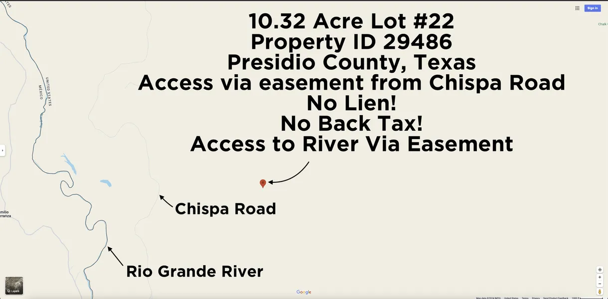 Legal Description: LOT 22, A 10.32 ACRE TRACT OUT OF THE NORTH HALF OF SECTION 65, BLOCK 2, T&P RR COMPANY SURVEY, PRESIDIO COUNTY, TEXAS.