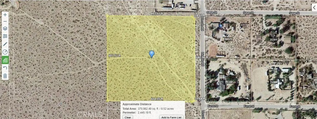 Seller will carry the note with $30,000.00 Down, balance payable in 3 Years @ 8.% Interest. No Credit or Income check. 8.66 acres of beautiful Flat desert land , just One block South of Paved Rd, Highway 247! Not far from the center of town, yet far enough away to feel at peace. Power poles running along Lincoln Rd. This is in a well area ( Buyer to Verify) . Homes across the street and on next parcel to the North. Most of them sit on +/-2.0 Acres parcels. There might be a good potential to Subdivide. (Buyer Must verify with the County). This property is only one block south from main paved rd. Old Woman Springs Rd. / Hwy 247. ASSESSOR'S PARCEL # 0450-124-28-0000 Buyer must verify all information regarding the property including, square Footage, Property Boundaries, Zoning, permitted Uses, Utilities availability and Costs, Etc; with the appropriate agencies. Information herein was obtained from sources we deem reliable, but no guarantee of any kind is herein made or implied by seller / agents. Buyer might need to install a water well as water source. Electric pole on the street.,