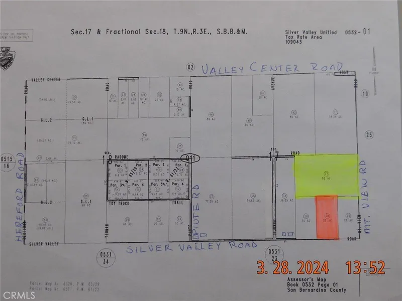 Motivated Seller, make offer. PRIME location in Newberry Springs. This has to be one of the best opportunities available in the area. Two adjoining parcels, totaling 80 acres on paved road, centrally located in Newberry Springs. The 20 acre parcel fronts on Silver Valley Road, the 60 acre parcel is behind the 20 acre parcel and has frontage on Mountain View Rd. Palos Verdes Road is at the NE corner of the 60 acre parcel. The parcels are NW of the corner of Silver Valley Rd and Mountain View Rd. The two parcels together are shaped like a "T". The parcel numbers are 0532-011-28 (20 acres) & 0532-011-37 (60 acres). These parcels are located approximately just 660' east of the homes at 44522 Silver Valley Rd. Silver Valley Elementary School is just over a mile east of this property. What a great place this would be to build your ranch. Alfalfa fields are nearby. Lot sizes indicat...
