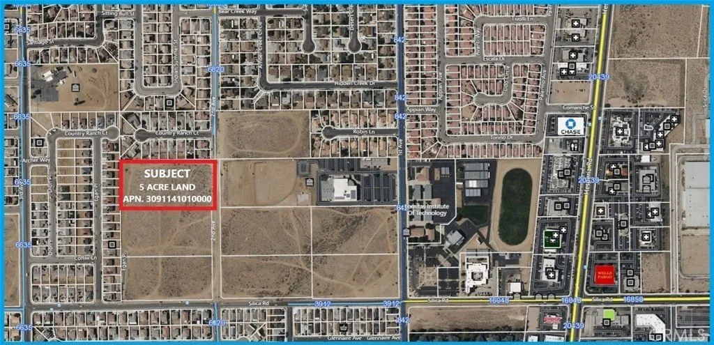 To view this land or to submit an offer, please contact listing agent Mohammad Alam at 760-646-3423. Prime location!! 5 ACRES OF DEVELOPMENT LAND!! Surrounded by newer homes just west of Hesperia Road near Silica Road. This land is located in the middle of everything. Surrounded by housing tracts and right across of Bible Baptist Church. One block west of Victorville Business District. Caddy corner from Mountain View Montessori, Lomita's and Elementary School. Only one block west of Wells Fargo Bank, Desert Community Bank Building, JP Morgan Chase Bank, 1/2 mile north of Desert Valley Hospital and all type of medical offices. Only about a mile from the most busy intersection of Bear Valley Rd with Vons Shopping Center, Starbucks, Walgreens, US Bank, Ross and all major businesses. Less than 10 minutes drive to I-15 via through Nisqually Rd. The seller has an 18 homes expired site plan but city of Victorville will re-approve with new submission. AN EXCELLENT LOCATION FOR A DEVELOPMENT OPPORTUNITY!! MOTIVATED SELLER!!