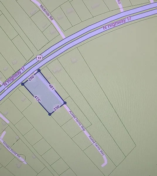 Owner will subdivide and sell 2 acres of the 2.64 acre tract located in the rear. The owner will keep the 0.64 acre that is located and fronts Highway 17 where the house is located . Access to the 2 acres will be from Azalea Farms Rd.