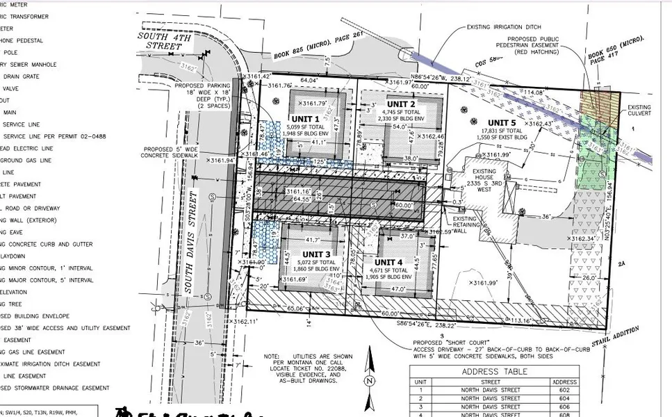 Shovel ready building lot in central Missoula, near Bensons Farm. Unit 3 is 5053 square feet with underground gas and electric, communication, sewer, and water service with meter pit all on property. Private road with poured concrete curb, city sidewalk has been completed in the ROW. One of the owners is a licensed real estate agent in Montana.