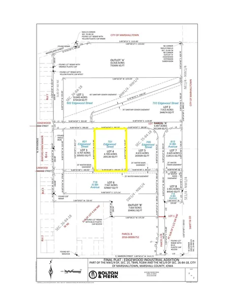 Lot 4:This is an industrial building lot that offers great potential for commercial ventures. Situated in a prime location, this lot provides ample space for establishing an industrial facility. With a sizeable area and convenient access, it presents an excellent opportunity for various industrial operations. Its strategic position makes it an ideal choice for businesses seeking a centralized location. This building lot is poised to accommodate the needs of diverse industries, making it a promising investment for those seeking to establish or expand their industrial ventures. These lots have been designed so the City of Marshalltown's storm water detention requirement is met off-site through a City installed, owned, and maintained storm water regional retention basin. The City's requirements for storm water detention, will not be required on these lots. Additional information provided up...