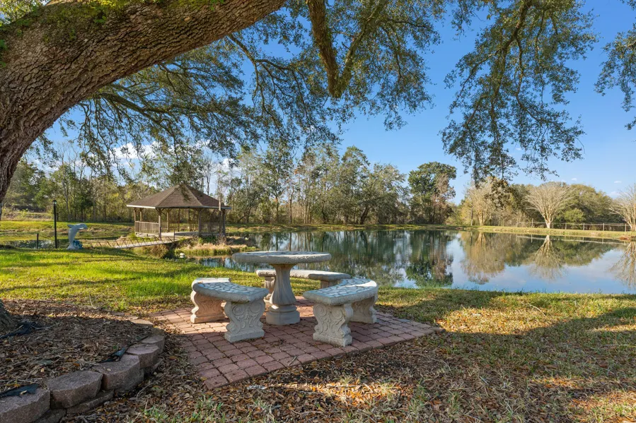 Cantonment, FL- 18+/- Acres, 2356 sqft Home, 711 sqft Guest Cottage, Horse Barn, Shops & Year round fishing from your own Gazebo over the 1-ac spring fed pond with bass, bream & catfish! This beautifully maintained southern getaway features a wide porch & lush lawn landscaped with Persimmon, Pear, Fig, Satsuma & Pomegranate trees! The main 4-bed, 2-bath home is truly an entertainer's dream with an uplifting interior, expansive great room, formal dining area & high vaulted ceilings. **BONUS Hurricane shutters can be bolted over all windows & doors offering HO insurance savings. Other highlights include a wood insert fireplace in the great room, whole house water filter & security system. This custom-built kitchen will surprise you with a 5 burner gas stove, plenty of granite countertop space, custom cabinetry, center island with breakfast bar & pantry. The open flow between the kitchen, dining & living area provides a practical space to make the most of a holiday lifestyle. Retreat & rejuvenate in the separated main suite that provides a large bathroom, walk-in closet & pleasant sunroom to watch the sunset. The two other bedrooms are spacious with the option to use the loft as a 4th bedroom or office space. The separate guest quarters feature a covered porch, cozy kitchen & full bath. Each home has its own septic tank. The main house offers a double garage & there's a carport for the cottage. This lifestyle property is a horse lover's dream with a 40.5x100 metal horse barn, equipped with stalls & a tack room & fenced pasture. A 31x50 workshop with covered storage & a 40x24 metal barn provides ample space for all his toys. There's power to the gazebo & barn. Keep a green lawn & water horses with city water & a deep well. Conveniently nestled in a rural setting just 2 mi from sought after schools & a few miles away from parks, nature, beaches, restaurants, great shopping & lively entertainment district. You've found excellent country living! Call today for a tour! No Mineral Rights to convey.