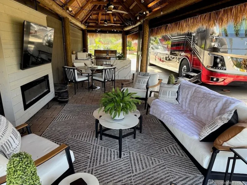 Simply Stunning Lot with Breathtaking Waterfall View! This exceptional pull-in lot offers a prime location, just steps away from the clubhouse and all community amenities. Surrounded by mature landscaping that ensures privacy on both sides, it provides the perfect retreat to sit and listen to the waterfall and watch the golfers tee off nearby. Built in 2021, the spacious tiki features automatic screens and a fully equipped, beautiful quartzite kitchen complete with an island featuring a waterfall edge. The elegant TV wall with a cozy fireplace insert adds to the luxurious feel. Included in the price are all furnishings, storage units, plus a top-of-the-line $5,000 Napoleon grill! Tastefully decorated with a warm, homey touch, this lot is the perfect spot for you and your coach. With that incredible waterfall view and the gorgeous amenities, it's an opportunity you won't want to miss - this gem won't last long!