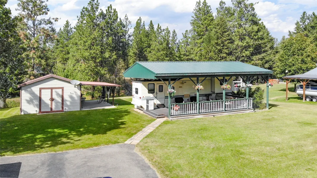 Located just minutes away from Lake Koocanusa, in the charming Town of Rexford, is this turn key property. Almost one-half acre in size, this property comes complete with a 1994 33.5' Prowler camper, including a 26'x36' cover, and a lovely front porch to sit on, relax, and enjoy. Storage is found under the front of the camper as well as an additional 16' x 26' building, with a stove, refrigerator and freezer inside. On the exterior of the additional building, is a covered 11' x 24' concrete patio for more of your outside enjoyment. An additional 8' x 8' storage building is attached to the building as well, that holds the riding lawnmower, that comes with the purchase. Two exterior frost free spigots as well as an additional RV hookup is found on the property. Fiber is available at the road. An apple tree bearing tons of fruit complete this property, waiting for your enjoyment today. Call or text your real estate professional today for more information!