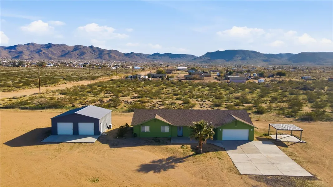 Welcome to your own slice of desert paradise in sunny and beautiful Golden Valley, Arizona! This well-cared-for site-built 3-bedroom, 2-bath home offers 1,563 sq. ft. of comfortable living space and sits on a cleared and pristine 1.71-acre parcel, fully fenced with chain link and secured by a remote-operated solar gate. Step inside to find a warm and inviting interior featuring tile and carpet throughout, a spacious kitchen with granite countertops, pantry, propane stove, and breakfast bar, plus a large dining area perfect for gatherings. Just off the dining room, a door leads to the covered back patio, complete with a small fenced area ideal for your small dogs. The primary suite offers a private bath and a unique exterior access door, allowing you to step outside and soak in the peaceful surroundings at any time. Enjoy your morning coffee or evening beverage while taking in the spectacular Golden Valley sunrises and sunsets the views here truly shine. For functionality and flexibility, the home includes an attached 2-car garage with laundry hookups and a permitted 30x30 detached shop/garage with full electric and its own mini-split system, making it perfect for hobbies or projects year-round. This move-in-ready, turn-key property boasts valuable upgrades including a brand-new HVAC system (2024), a 4-year-old water heater, reverse osmosis system in the kitchen, security system, and all appliances included. The property is not in a flood zone, conveniently located near paved Aztec Road, and sits on the county-maintained road of Shipp. Water service is provided by Valley Pioneer Water Company. With space, upgrades, and unbeatable desert views, this home is truly a must-see.