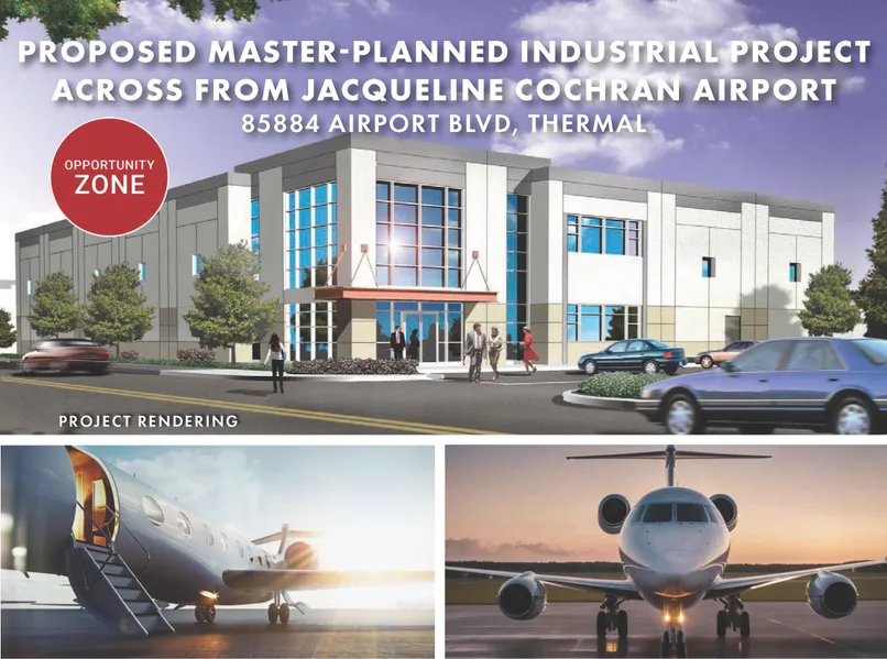 19.5 acres across from Jacqueline Cochran Regional Airport, with 43,500 aircraft operations in 2023. Jacqueline Cochran Regional Airport is currently exploring the possibility of adding commercial air service and cargo service to the facility. Conceptual plans for 392,880 SF industrial building and 300,110 SF state-of-the-art four building master-planned industrial project with dock high loading & large yards (see page 3). Utilities in street. Approx. 13,800 cars/day on Hwy 111. New interchange at Airport Blvd & Expressway 86. Three miles to The Thermal Club, a private high end race track. Across from Desert International Horse Park.