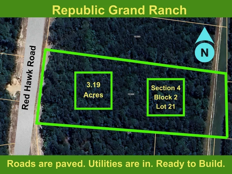 3.18 ACRES > NO DRAINAGE EASEMENTS > MATURE TREES > INTERIOR QUIET PARCEL > EASY BUILD SITE > SURVEY & GEOTECHNICAL REPORT AVAILABLE. Located on the outskirts of Willis with great schools and nearby shopping. Large lot wooded community with gentle rolling hills. Peaceful privacy. You will never be crowded by neighbors. Republic Grand Ranch is a large lot, wooded community in the rolling hills. Country lifestyle for your custom forever home. Trees, paved roads, water, HIGH SPEED fiber optic internet & underground power through out. Covered pavilions, parks, ponds, playgrounds, BBQ areas. Minutes from shopping, dining, schools, hospitals, and entertainment. Low taxes - No MUD tax. Average elevation is 400’ ASL. Plenty of greenspace and trails for hiking, biking and horseback riding.