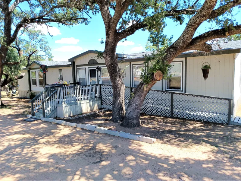 Beautiful oaks surround this 4 bedroom 3 bath manufactured home on 1.12 acres in Buchanan Lake Village! Property has great amenities with storage building, work shop, irrigated raised gardens, and fruit trees. Large open floor plan with vaulted ceilings, master -bedroom and an additional bedroom with it own bathroom access. Bonus room with French-doors that could be a nice office. Large kitchen with center island and pantry along with a good size dining room area. All appliances are 2019 or newer. Two living room areas, one with a fire place. A great lay out for entertaining! Laundry room/mud room. Raised back deck with enclosure for grilling and lots of company along with an open patio on the back lawn. Handicap accessible with a ramp to the front door. New (2021) 200 amp main panel with backup generator connection. New roof and New AC in 2021. Association amenities include a Homeowner park, marina and water access to Buchanan Lake. Quiet place with great access to the lakes and all the hill country has to offer. Come see it!