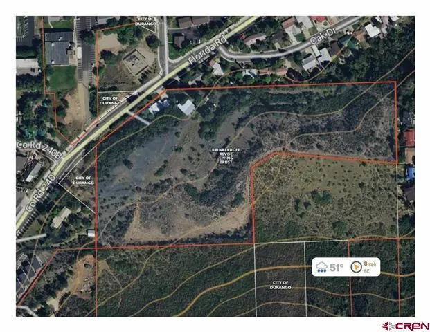 This unique parcel is the largest infill privately owned parcel within City limits of Durango. The opportunities are boundless in that there are various benches on the property that would allow different residential products to be developed. Located conveniently on Florida Road, just 9/10th of a mile from the intersection of 3rd Avenue and 15th Street, close to Riverview Elementary School, shopping, and services as well. The views the La Platas and north up the Animas Valley are exceptional and the way the property is situated it also allows for stunning views of Animas Mountain, Perins Peak & even Missionary Ridge. The site, with the different levels, can provide great view corridors for the residential product as well as creating privacy once developed. There is City property along much of the boundaries as well as easy access to trail systems. This parcel has been in the same family ownership for many decades and is now available for someone to create one of Durangos finest developments.