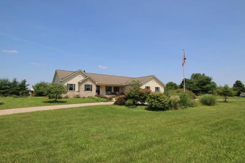 Great floor plan. Very open concept. 3/4 oval concrete (partial stamped) driveway. Two front bedrooms have been used by current owner as home offices. All they would need is closets.Kitchen, dining lead to a huge (21'2'' x 16') Great room (all cathedral ceilings) with stone front wood burning fireplace. Six panel solid oak doors and trim throughout. Generac generator is for back up energy. Lower level has dry wall and recessed lighting in finished ceilings, Trim is on site (oak) A half bath (dry wall for shower) to make a full bath. Potential of another living quarters. (roughed in for kitchen also) Lower level is another approx. 1500 square feet. Great room TV and wall bracket and kitchen / dining room drapes do not convey. Plenty of room to grow in this home sitting on 5 acres.