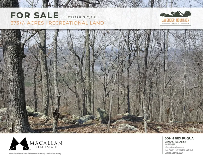 Macallan Real Estate is pleased to present Lavender Mountain Ranch, a unique opportunity to own a mountain top hunting retreat in the North Georgia Mountains. The property features unbelievable views of the surrounding area and supports a healthy population of trophy whitetail deer and mature turkeys. Under 2 hours from Atlanta and only 12 miles from downtown Rome, the property offers privacy with all the amenities you need close by.