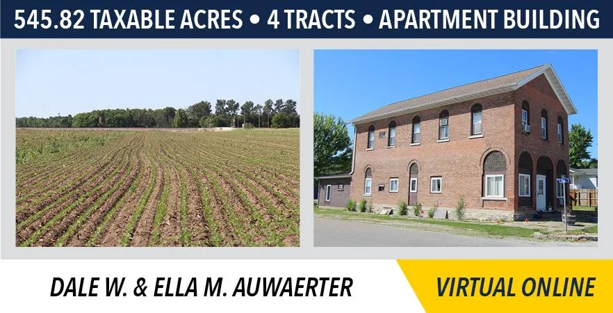 The Auwauerter Land will be sold in (4) four individual tracts. Tracts 1, 2, 3 & 4 will sell on a price per acre basis, based upon surveyed acres found in this brochure. Surveyed acres will be used to constitute the final settlement price. Tracts 1 & 2 will be sold through the marketing method of Buyers Choice whereas the high bidder can elect either or both tracts for their high bid. Buyers Choice auctioning will continue until both tracts have been elected. We will then sell Tracts 3 & 4 through the marketing method of Buyers Choice whereas the high bidder can elect either or both tracts for their high bid. Buyers Choice auctioning will again continue until both tracts have been elected. The tracts will NOT be offered in their entirety or in any combinations at the conclusion of the auction. We will then sell the apartment building for a Lump Sum, total dollar amount. Immediately following the auction, the successful buyer(s) will be required to sign a real estate sales contract and pay ten percent (10%) of the purchase price as a non-refundable down payment which will be held in escrow until closing. The balance of the purchase price will be due at closing which will take place on or about September 10, 2024 upon delivery of a merchantable abstract and deed. Taxes will be prorated to the date of possession. Possession of Tracts 1, 2, 3 & 4 will be given at the time of closing, subject to harvest of all growing crops. Possession of the improvements on Tract 4 will be given at closing. Full possession will be given on the apartment building at the time of closing. Tracts 1, 2, 3 & 4 sell free and clear for the 2025 farming season & there are no hunting leases associated with any of the tracts.
