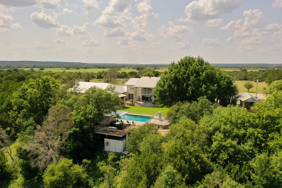 Here is a truly incredible 62.79 acre ranch featuring a custom 6000 sf home with a stunning view of the river bottom. The home features 6 bedrooms and 6.5 baths, including his and hers master baths. There are 2 living areas and a spacious kitchen with a nice walk-in pantry. The massive 50x23 game room boast a restored antique bar, full kitchen, an indoor grill with a commercial vent hood, full bath, two fireplaces and a workout room. Out back you'll find a beautiful porch overlooking the pool and deck with spectacular views all around. The land is a hunters dream and features 60 foot of drastic elevation changes, two stock tanks and is heavily treed with live oak, red oak, post oak, elm and many others. The property is currently ag exempt. Additional acreage is available.