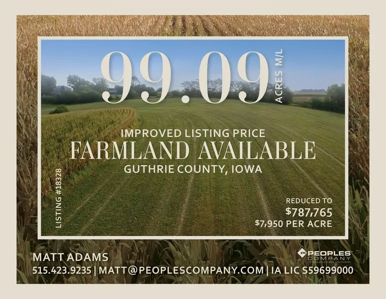 Guthrie County, Iowa Farmland Available! Peoples Company is representing the sale of 99.09 acres m/l located 3.5 miles north of Guthrie Center, Iowa on paved Iowa Highway 25 and in Section 18 of Victory Township. The farm includes 87.33 FSA cropland acres with 45.09 acres certified as cropland and 42.24 acres certified as alfalfa/grass. This gently rolling farm has an overall tillable CSR2 soil rating of 58.4. The alfalfa stand is two years old and has received fertilizer applications and reseeding to help get it established. Conservation practices are being actively applied, and several waterways have been re-worked and seeded down.