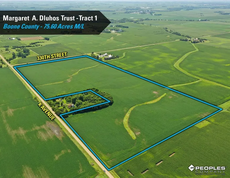 Boone County, Iowa Farmland Auction - Mark your calendar for Friday, October 17th, 2025, at 10 AM! Peoples Company is pleased to be representing the beneficiaries of the Margaret A. Dluhos Revocable Trust in the sale of their family farm located northwest of Woodward, Iowa, and northeast of Bouton, Iowa. The portfolio consists of 235.60 acres m/l and will be offered as two individual tracts. The tracts are located in Sections 26 & 27 of Peoples Township, Boone County, Iowa.