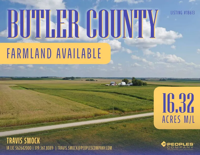 Peoples Company is pleased to offer 16.32 acres m/l of highly productive 90+ CSR2 farmland in Butler County. The farm is considered nearly 100% tillable with 15.23 acres currently farmed, 0.89 acres enrolled into CRP, and 0.13 acres in grass waterways. The tillable soils carry an impressive CSR2 rating of 90.1. The 0.89 of CRP are enrolled into a CP8A Grassed Waterway contract paying $267 annually through 2031. This is a rare chance to purchase extremely high-quality soils in a smaller package, creating an excellent opportunity for new investors and beginning farmers to get into land ownership. The property is situated north of Allison and west of Clarksville, along Marsh Avenue, in Section 6 of Jackson Township, Butler County, Iowa.