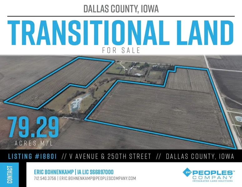 Dallas County Transitional Land For Sale - Peoples Company is pleased to offer 79.29 acres m/l of transitional farmland located in Dallas County, Iowa, just north of Urbandale's corporate limits and west of the City of Grimes. The property is strategically positioned within the path of development and benefits from close proximity to both existing neighborhoods and planned residential projects in the rapidly growing western suburbs of the Des Moines metropolitan area.
