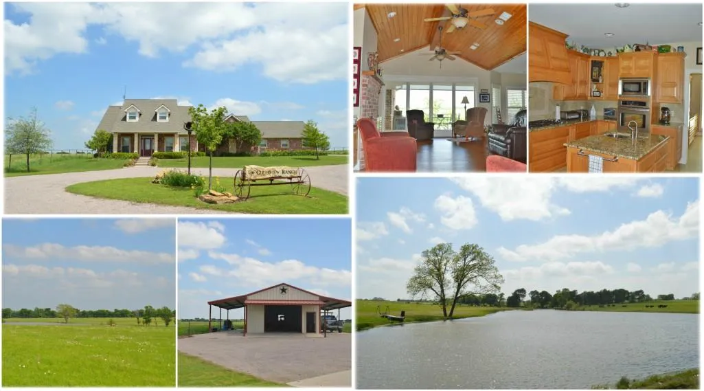 Remarkable 235 acre ranch with beautiful brick and stone country estate home featuring 7 ponds with 2 quite large, excellent fencing, cross fencing, 11 cattle guard crossings to pastures, 2 large barns and workshops, 1.2 miles of paved road frontage plus county road frontage, excellent improved pastures with scattered trees and some wooded areas, plus a natural gas meter for economic heating. This ranch is highly productive and beautiful.