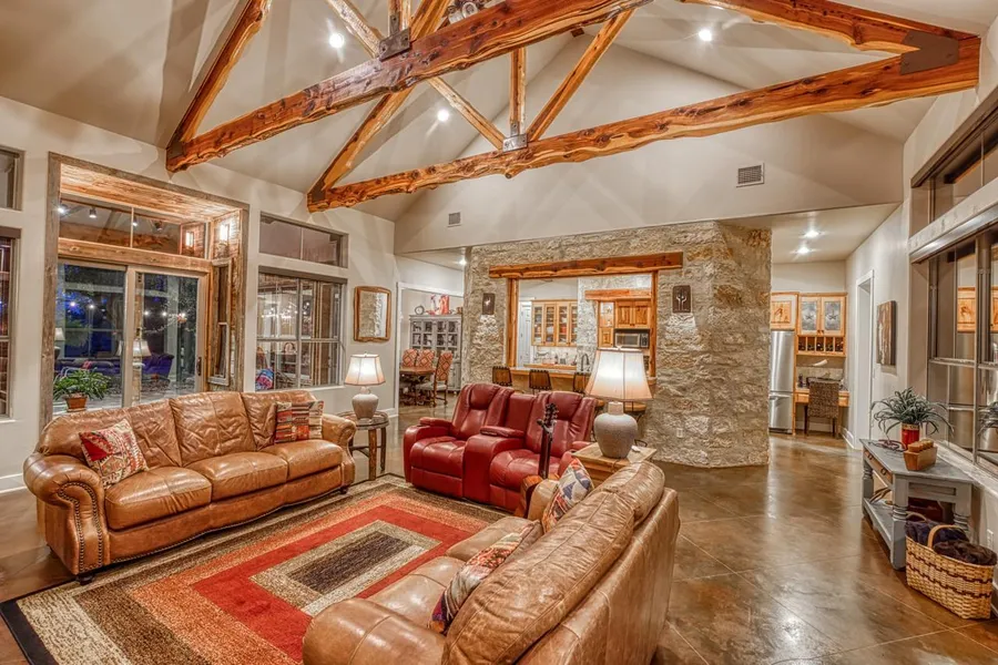 The Main house is approx. 2622 SF and offers a split floor plan with 3 bedrooms, 2.5 bathrooms, majestic stone fireplace, high ceilings, custom pecan cabinets, hand hewn reclaimed barnwood and timbers, lots of storage, lighted back covered porch and pavilion and much, much more! The Mueller Barndominium is 1500 SF and features an approx. 700 SF 2/1 apartment, finished out as nicely as the Main House, with the rest serving as a Man Cave/Shop area, storage and covered equipment area. Native limestone with caprock mortar are on the exterior of both structures, as well as the reclaimed barnwood.
