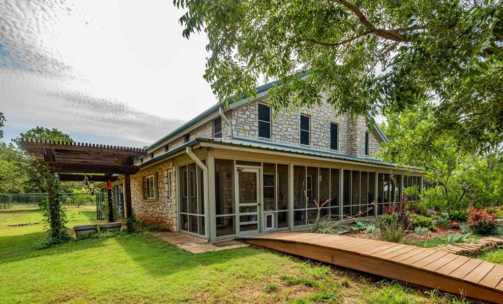 The exterior of the home is limestone rock with a metal roof, very complimentary of the setting and this area. The home is set up to house up to eight guests currently. Peaceful mornings and evenings are well complimented by the very spacious screened-in porches complete with ceiling fans. The landscaping surrounding the home is extremely attractive, very well maintained, and fitting for the surroundings.