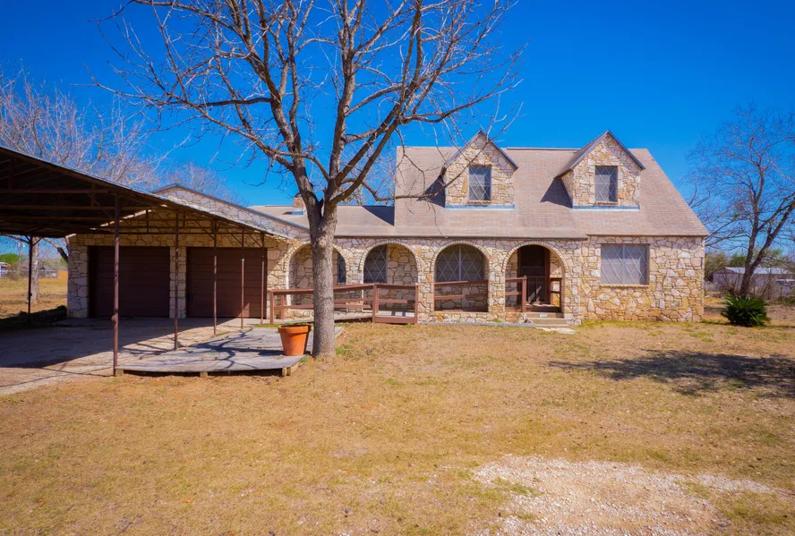 This homestead sits on almost 2 and a half acres. The home has a formal living plus a den that's great for family gatherings. Four bedrooms and 2 baths are all on the upper level. There's a detached office space/utility building. A private well is in place for irrigation and there are mature producing pecan trees in front and schools are just down the road, very close by. Just a short drive to San Antonio and Pleasanton.