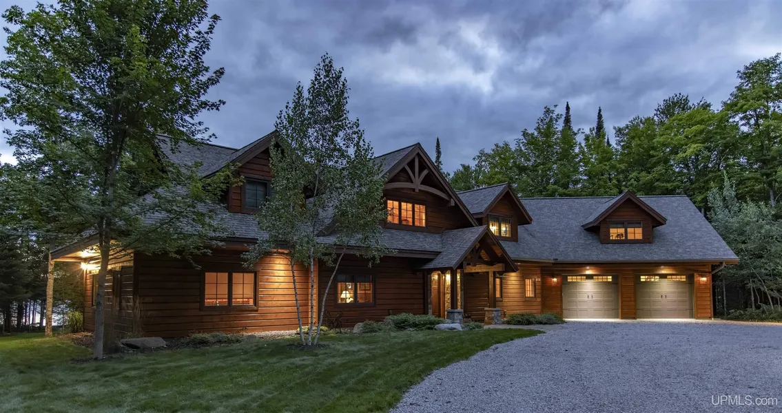 Move-in ready and waiting for you, this executive home on 10 acres is situated on the private, serene Homan Lake in Iron County, Michigan. The moment you arrive, you’ll never want to leave. The property is beautifully landscaped, with recently epoxied garage floors and freshly stained buildings. Step inside to discover engineered elm floors with in-floor heating, extending even to the attached garage. The open-concept layout features a chef’s kitchen with soapstone countertops, Alder wood cabinets, and vaulted ceilings that flood the space with natural light. Entertain guests in the dining area, complete with a freestanding Woodstock Soapstone fireplace, or relax in the all-season sunroom, which boasts a built-in grill, hood, and stunning lake views. The living room offers another cozy retreat with a handpicked Montana stone fireplace. The main home includes four bedrooms and 2.5 baths, ...