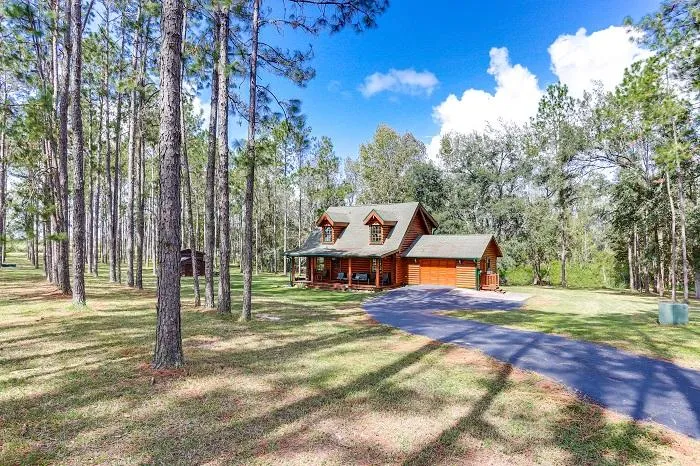 You won't believe the craftsmanship and tender loving care put into to this authentic log home located on a paved road! Non-smoking, original owner has meticulously maintained this 3 bedroom, 2 bathroom country home sitting on 3.4 acres of heaven. The two car garage was converted into a large bedroom/kitchenette combo. Can easily be converted back if desired. This cleared land is lightly wooded with pine trees but still open enough for sun and activities. Master and 2nd bedroom are on second floor with gorgeous picture window views of the grounds. The storage under the home, with paved slab, is ideal for those seasonal items. Not in a flood zone. Also a mini log home for storage on premises with a cement slab. Located only five minutes from I-75 and Blanton Rd exit. Call today, as this beauty will not last!youtu.be/BXBGhX3YniA