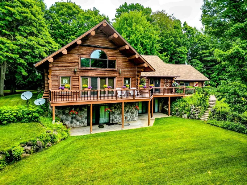 Step into a life less ordinary with this breathtaking custom-built solid log home—where rustic elegance meets serene seclusion, just a short stroll from Timber Ridge Ski Resort and only minutes from the expressway. Tucked at the end of a winding 750-foot paved drive and surrounded by whispering woods, this enchanting retreat offers over 3,500 square feet of warmth, wonder, and timeless charm. The heart of the home beats in the stunning main floor, where imported wide plank heart pine flooring from France glows beneath vaulted ceilings. An executive kitchen is made for gathering, featuring rich granite counters, a 10-foot island, double ovens, gas stove, and stainless steel appliances—all opening to a great room anchored by a massive stone fireplace. Wake each morning in the peaceful main floor primary suite, complete with a full bath, double sinks, and French doors that open to the dec...
