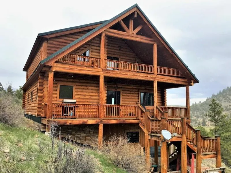 Beautiful log home built with full swedish cope standing dead 10-inch logs. This home was built on a spot that optimized the incredible mountain views of Del Norte Peak, and surrounding mountains. The home has quartz counter tops in the kitchen and bathrooms, tile floor interior and carpeted bedrooms, with accent sheet rock walls done in tasteful shades of grays. The kitchen has custom cabinetry with soft close features. There is a spacious master suite on the main level complete with double sinks in the bathroom, walk through closet, and walk in tile shower. Upstairs are two guest bedrooms, each with private bathrooms, one full bath with tub/shower combination and one with a 3/4 bath. There is a half bath off the kitchen dining area as well. The main living room is open to the kitchen and dining room and there is a utility room off the kitchen with doors for noise mitigation. The insula...