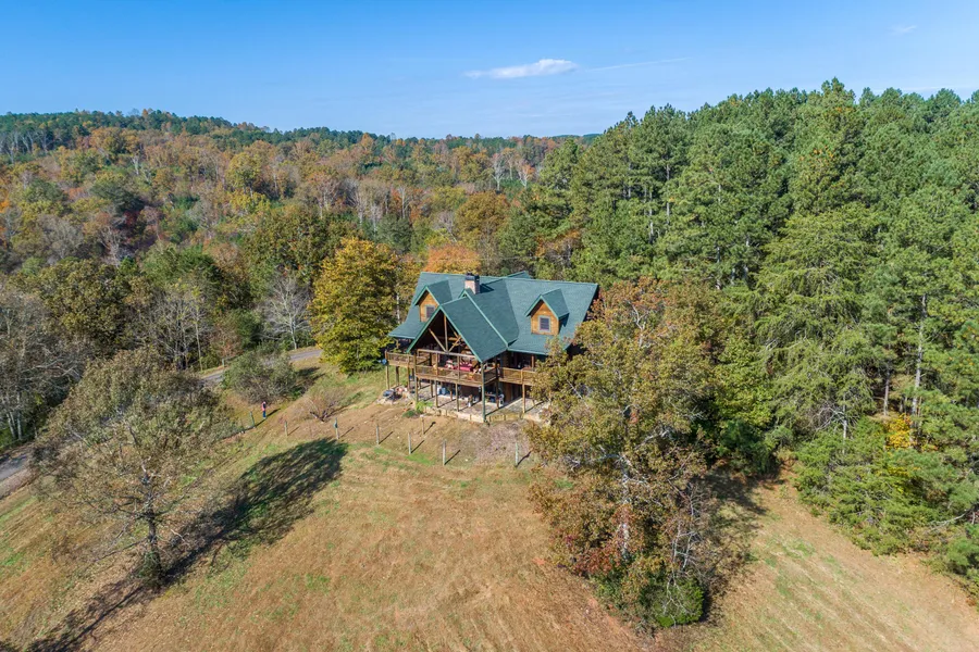 This Custom built true log home has many upgrades and is situated on the back of a private 12 acre tract that offers a diversity of landscape and property features. Oversized indoor gas cooktop stove is great for chef style cooking or entertaining. Granite countertops throughout with gorgeous custom stone island/bar for extra seating. Custom tile kitchen and dining room floors transition to pretty wood flooring in Livingroom area. Views from the Livingroom or dining area are spectacular. Sit by the cozy glass door fireplace in cool weather or on the back deck in summer. Every turn of the head yields craftmanship and detail. Beamed ceilings and heavy duty construction methods were used in assembling this custom built home. Gorgeous master bedroom and master bath with granite, large soaking tub, shower and huge walk-in closet. Two large bedrooms, den and full bath upstairs and a craftsman style workshop in the basement. Basement stubbed for bathroom if you have a mancave design in mind for downstairs. Adorable horse barn with 5 stables and hay loft sits on the hill across the grassy valley. The west side of the property has beautiful green grass bottom land with over 800 ft of clear running stream winding through the middle. Deer and turkeys also have plenty of hiding places here until they hear the corn bag rustling. Nice level garden spot at the bottom of the hill and driveway has produced many nutritious meals for the family and through good composting will continue to produce organic delights for the new owners! NO RESTRICTIONS-grow your own beef, pork, chicken, eggs along with vegetables of choice, heat with wood and build some target ranges for shooting if that's your hobby. Not many places left where you can be self sufficient off the land!