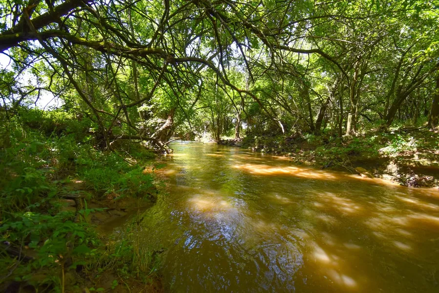 The property boasts a creek estimated at 2,000’ long that runs north to south through the middle of the property. The heavily wooded creek area creates a fun place for kids to explore and splash around throughout various times of the year. In addition, it provides a water source as well as thick cover for the wildlife moving throughout the area. We observed numerous deer coming in and out of the creek bed area and wooded thicket during our time photographing the farm. Also, we believe this creek runs intermittently, with heavier flows during the rainy season and presumably much less during the warm summer months. We estimate 26 acres of the farm resides west of the creek. This western side features the majority of the elevation change on the property and is marked more by the rolling hills one will find. On this side, one will also enjoy a acre pond that could serve as your own fishing hole!