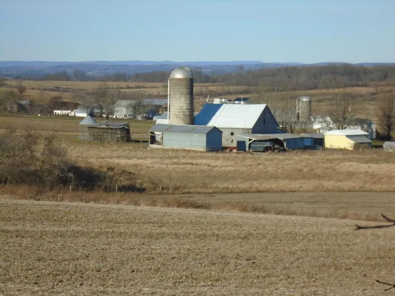 #1181 - has 94 acres, all open land, basically all tillable with long views. No woods. Over 4700 of frontage on two roads, great farming area. There is a good home built at the turn of the century which has tenants + an apartment where an elderly former owner enjoys life tenancy. It is handicapped accessible for him. 4 Bedrooms, 2 baths, 2400 square feet of living space, oil hot air heat, both enclosed and open porches. Also a 2 car garage, a 50 cow dairy barn w/full loft, and 2 machinery sheds. Well kept, looks like a farm ought to look. $510000.