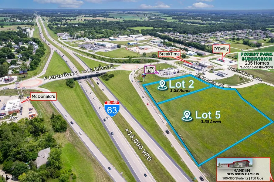 Excellent Visibility: HWY 63 & E BROADWAY. Lot(s): Vertical Ready. Adjacent To: TACO BELL [NEW], BREAK TIME C-Store, O'REILLY AUTO PARTS [NEW], FOREST PARK SUBDIVISION [NEW - 235 Homes]. Primary Access: To RANKEN TECHNICAL COLLEGE [NEW]. The Mid Missouri Region Six County Hub. TOP 3 Fastest Growing Cities in Missouri.