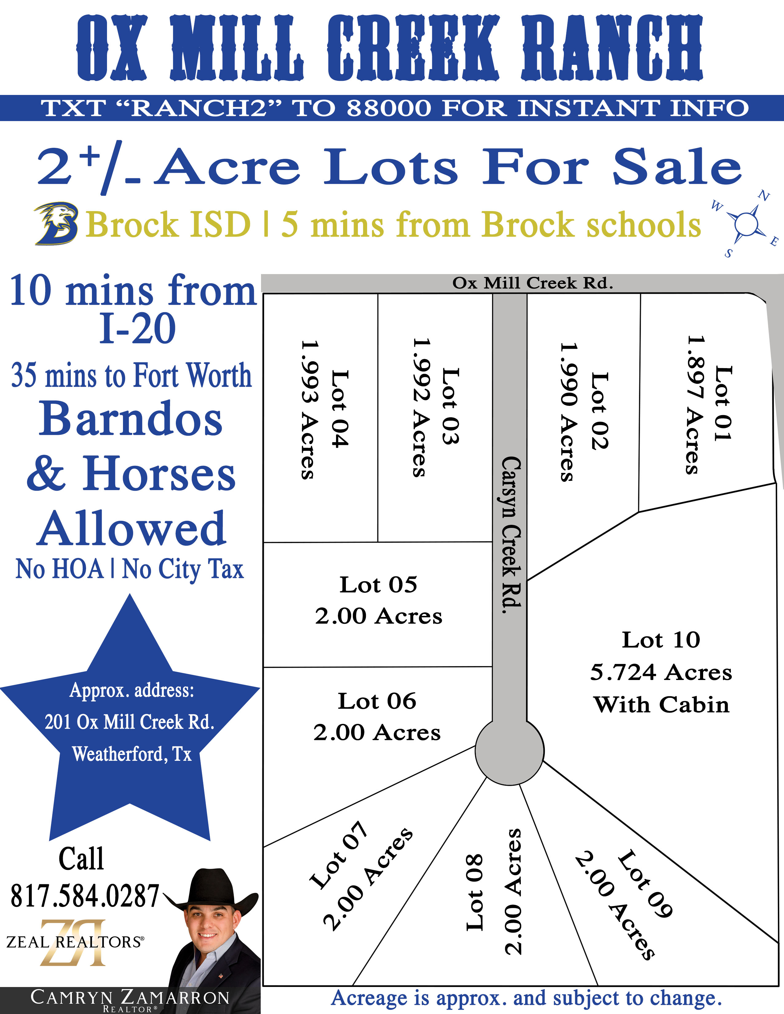 Research Parcel InformationFrom I20 Take exit 403 for Dennis Rd South from Weatherford and take a left on Ox Mill Creek Rd. After 1.1 miles, Lot will be located on the right. Property marked with signage. Approximate address: 201 Ox Mill Creek Rd.