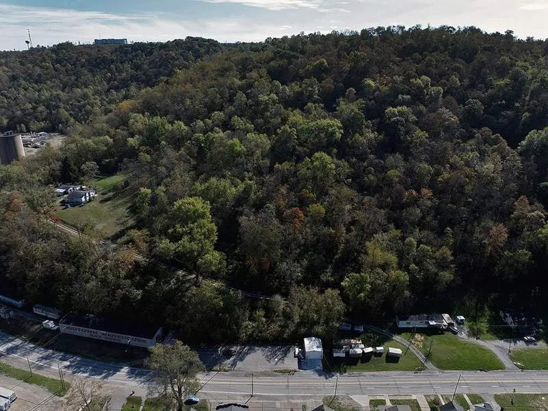12.43 acres on National Road in Triadelphia. The front of the property runs parallel with National Road. The back of the property backs to property owned by the Ohio County Commission near the Cabelas Warehouse. None of the buildings you see in the pictures are on the land. There are no buildings on the property.