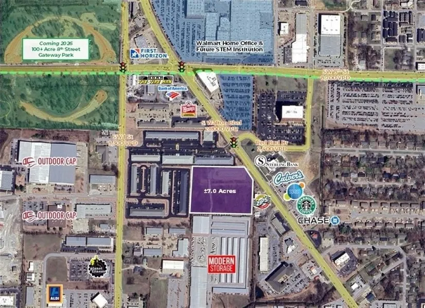Flat, Cleared and ready for immediate development. ± 168 linear feet of frontage on S Walton Blvd with excellent visibility. All utilities available to site and once of the few properties with sewer capacity access. Seller has Grading Permit Plans, plus soil testing and boring have been performed. Largest vacant tract of land on S Walton Blvd. Within walking distance to Osage Park and the new 100-acre 8th Street Gateway Park. Numerous national retailers in the immediate area, such as Walgreens, Walmart, Starbucks, Culver's, Wendy's, Raising Cane's, Whataburger, and Five Guys Burgers and Fries, among others. Located 0.3 miles from the future location of a new STEM education institution for the next generation of innovators, builders, and entrepreneurs.