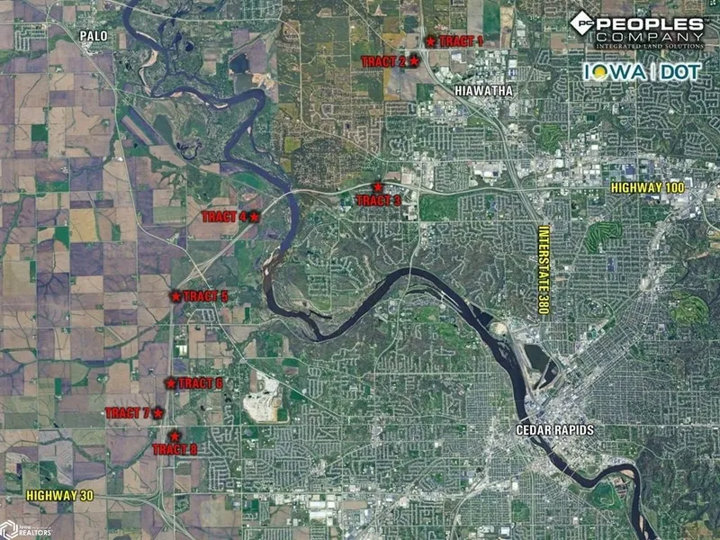 Offering eight individual tracts owned by the Iowa Department of Transportation through an ONLINE ONLY auction where all bidding must be done online or through Peoples Company’s bidding app. Bidding will be LIVE until Wednesday, October 15th, 2025, at 4:00 PM Central Time Zone (CDT). Closing is to take place on or before Wednesday, November 19th, 2025. The tracts include various types of land located in Linn County near Cedar Rapids. All tracts are situated along the Interstate 380 and Highway 100 corridors and offer a wide variety of future development potential. Visit our website for more information regarding this 8 Tract Auction.