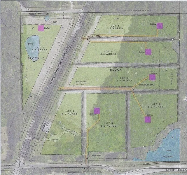 KETTLE KOVE ESTATES Location is GREAT! Barely 2.5 miles from I-35 and freeway access!! This is a small-acreage Subdivision with 5 open and wooded lots available, ranging in size from 3.94 acres to 5.92 acres. These lots are "Shovel Ready" as they are approved by the City of Columbus, Anoka County and Rice Creek Watershed District. Lot Owners will only need to obtain Building, Driveway, and Septic System permits as required by the City of Columbus. This lot is open and level with some trees along the southern and western boundaries. As required by the County, Buyer's driveway will come off of 159th Ave. NE. You can also bring your own Builder!